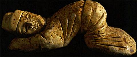 La mort métamorphose le défunt telle une chrysalide aspirant â la vie. Déjâ le visage a repris ses traits tandis que le corps poursuit sa reptation ascensionnelle. Sérénité du visage émergeant de l'effort, la renaissance aux prises avec le silence anonyme. La pâte de porcelaine s'articule en segments emboîtés comme autant d'étapes vers la lumière.